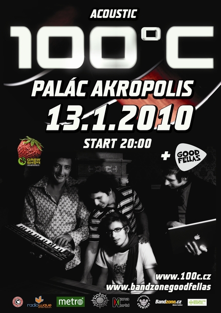 info 100°C a jejich speciální akustické vystoupení, jako host se představí GoodFelas. Při příležitosti akustického vystoupení 13. ledna v Paláci Akropolis natočí 100°C své první koncertní DVD. Jako host večera vystoupí akustický projekt Goodfellas. Pro lednový koncert si 100°C připravili několik odlišných verzí svých skladeb. Lehce “naswinglé” podoby se dostalo skladbě Azataki, rockověji působí poslední singl z desky Brant Rock One Time. Mimo těchto skladeb čeká posluchače průřez písněmi z prvního alba Evergreen přes singl Cream až po nejnovější remixy skladeb Who I Am a George. Jako hosté se objeví zpěváci Marek Hupač (DJ set na afterparty) a Sabina Feldmanová. GoodFellas vydali minulý rok svou první desku Sweet and Lowdown za produkce Honzy Horáčka. Se skladbami z alba podnikli na podzim 2009 turné se skupinou Model Bazaar. |