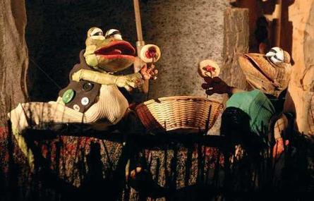 Inscenace je určena dětem i dospělým. Příběh dvou slavných žabích kamarádů (Kvaka a Žbluňka z knihy Arnolda Lobela) je rozšířen o postavu vypravěče – osamoceného podivínského obyvatele starého domu. Příchod žab do jeho opečovávaného rybníčku jej přivede ke snění. V proutěném křesle spřádá, rozvíjí a usměrňuje činy žabáků, čímž překonává vlastní samotu. Nechává svět za svým oknem prostupovat dovnitř a přijímá zvláštní hosty přicházející z krajin fantazie. Pak se postupně sám stává účastníkem vlastního příběhu… Loutky ze dřeva a kůže jsou velcí nohatí maňásci. Kromě dalších dřevěných zvířátek z dědkovy zahrady hrou proplouvají svítící papírové ryby. Scéna je z kůry, dřeva a bambusu vypěstovaného na zahradě výtvarníka Antonína Maloně. |