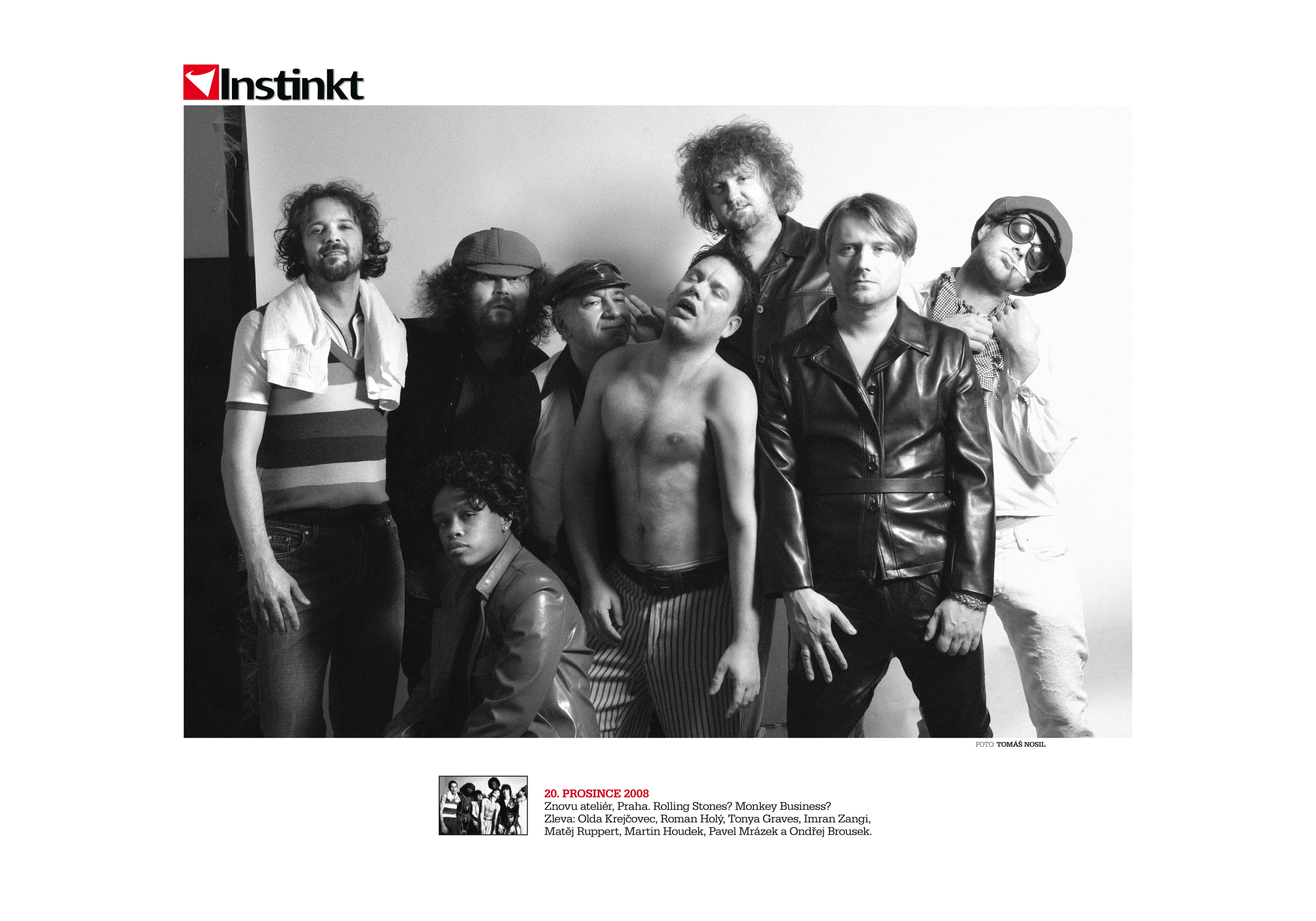info Foto: Tomáš Nosil, Karel Šanda Produkce: Karolína Lišková Když fotografka Annie Leibovitz kdysi v polovině sedmdesátých let nabídla redakci čtrnáctideníku Rolling Stone, že vyrazí na turné s tehdy nejslavnější a nejdivočejší kapelou světa Rolling Stones, rozmlouval jí to i šéfredaktor titulu Jann S. Wenner, jinak též bohém a divočák. Jak totiž každý věděl, kdo tehdy s partou kolem Jaggera a Richardse vyrazil do světa, zpravidla skončil jako feťák. Leibovitz se ale nedala, nafotila úchvatný dokument a mnoho let se pak léčila z drogové závislosti. Její dílo nás a kapelu Monkey Business hluboce zasáhlo a inspirovalo ke společnému dílu. Náš fotograf Tomáš Nosil, který s českými hvězdami strávil mnoho dní, se zatím z ničeho neléčí. Petr Skočdopole, šéfredaktor INSTINKTU |