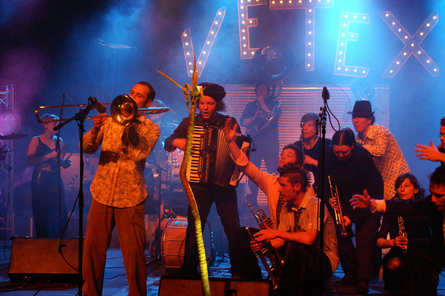info VETEX - nespoutaný živel z Bruselu! Propojení balkánské hudby s Bollywoodem. Zážitek plný emocí! L‘Orchestre International du Vetex se od jiných západoevropských kapel, inspirovaných balkánskou vlnou, podstatně liší – a to nejen přítomností akordeonu anebo přesahy do jazzu. Hutný a přitom elegantní, temně zářivý zvuk kapely občas zní jako jihoitalská banda, tedy důstojně kráčející dechový ansámbl s repertoárem sahajícím od lehké klasiky až po pohřební pochody. Jindy – jako například v humorně nazvané skladbě Vetex-Mex (tedy Tex-Mex z belgické textilky), slyšíme ozvěny neodolatelného karibského rytmu cumbia, a Mishra Kal Urlu představuje organické propojení turecké hudby z Balkánu s Bollywoodem. Plná sestava čítá patnáct dechařů – od flétny a klarinetu přes trojici trombonistů až po sousaphone, vizuálně téměř šokující nástroj, nápadný obrovitým zvukovým trychtýřem, který ční nad hlavou hudebníka jako z plechu vytepaná svatozář. Skupina získala svůj název podle belgického textilního koncernu Vetex, jehož opuštěnou tovární halu používala jako zkušebnu. Sestava je – jak indikuje název – skutečně mezinárodní a multikulturní, s muzikanty z obou jazykových zón Belgie i z Francie. První album natáčela ve francouzském městě Lille, ve studiích v kulturním areálu Maison Folie de Moulins, který vznikl rekonstrukcí starých pivovarů. Následovala turné v jižní Francii, Itálii, koncerty v Rotterdamu a La Rochelle. V roce 2008 kapela absolvuje 8 tisíc kilometrů dlouhé turné na Balkáně, koncertuje v Sarajevu, Bělehradu i v Bulharsku, a v Mostaru se setkává se zpěvačkou, trumpetistou a akordeonistou z Bosny, kteří pak hostují na novém koncertním programu Balkan Banquet. Není to neuvěřitelné? Téměř dvacetičlenná sestava hrající na opravdické nástroje prosperuje v éře deejayů, samplů i laptopů. Petr Dorůžka |