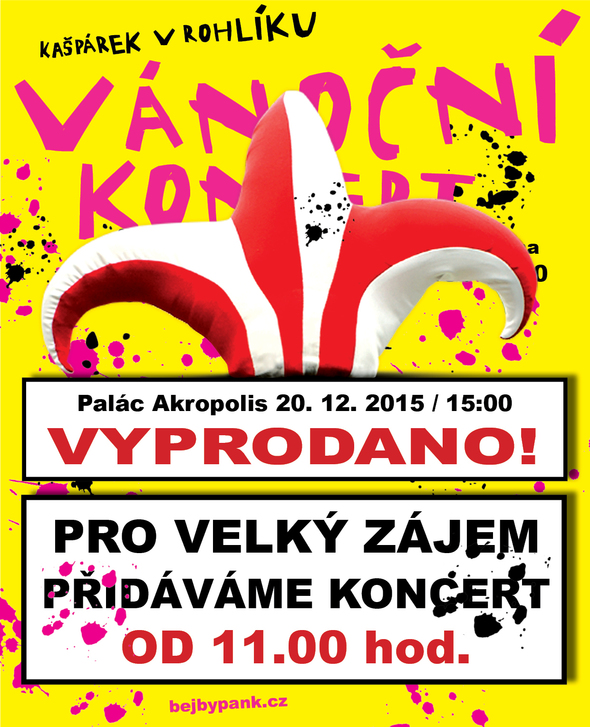 info ORIGINÁLNÍ AKCE V PRODUKCI BEJBYPANKU TENTO KONCERT JE VYPRODÁN! POZOR! PŘIDÁVÁME KONCERT! Ale prosíme tímto všechny zájemce, aby sdíleli jak vzteklý. To aby Vás bylo dost a nemuseli jsme rušit! Jinak od 11:00 se hraje se stejnou pankovou vervou jak od 15.00, tak se nikdo nemusí bát! Již nyní lze koupit zde: bejbypank.cz Dostává ježíšek dárky? Nadělí kašpárek nové songy? Bude to jízda i bez saní? Lze přežít bez koncertu bejbypanku vánoce? Existuje panková koleda? Zakáže ministerstvo vánoc koncert? Tak to jsou otázky z Kašpárkova plakátu, které nám napovídají, že bejbypankoví průkopníci nezklamou a akce bude opět divokou poblázněnou jízdou a zábavou pro rodiče i jejich děti! A nejen to! Kašpárek České republiky ze své funce prezidenta národní zábavy slibuje i určitou slavnostní úroveň akce. Kašpárkův originál Kašpárek v rohlíku hraje každý rok pro radost bejbypankáčů desítky koncertů na různých akcích po celé ČR. Ale pouze několik z nich pořádá a vymýšlí Kašpárek sám. Ty jsou pak samosebou originální a nikde jinde už je takto neuvidíte. A prosincová Akropole nebude vyjímkou. Zazní nové songy, odhaleny budou speciální koncertní choreografie, předneseny budou promluvy v pravdě vánoční, dojde i na nějakou tu dojemnou koledičku, premiéru bude mít klip z předešlé Akropole a hlavně dojde ke skupinové vánoční fotografii Kašpárka a jeho party se všemi diváky. Kašpárek překoná rekord v jedení vanilkových rohlíčků se salámem na čas! Nebudou chybět prskavky, ohňostroj a následný zásah hasičů. Vánoční pohlednice Kašpárek se rozhodl letos založit společnost za obnovu pohlednic! Z hrůzou totiž zjistil, že děti (a někteří dospělí) nemají „ánunk“ neboli „ví prd“, co to je poslat někomu pohled či korespondenční lístek a většina z nich je schopna napsat zprávu do místa pro adresu, protože tam jsou linky! A to bez ohledu na to, že všichni umí od 6 měsíců života mailovat a likovat! Tak budou moci návštěvníci koncertu napsat sami sobě či blízkým vánoční Kašpárkovu pohlednici a vhodit jí do bejbypankové poštovní schránky! Není nic dobrodružnějšího než odemykat dopisní schránku v očekávání milého psaní! Sakramejdlo aneb Kašpárkův speciální host! Ano i tentokrát bude mít v kloubouku Kašpárek v rohlíku speciální hosty! Jeden z již odtajněných je holčičí hudební „pancrfaust“, vynikající dívčí žolík, skupina Sakramejdlo! |