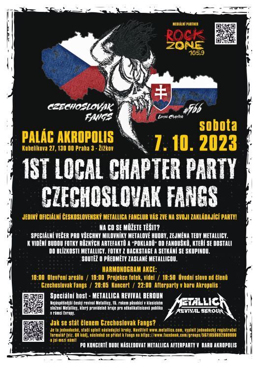 info Speciální večer otevřený všem nadšencům rockové a metalové hudby, věnovaný mimo jiné všem fanouškům Metallicy, k vidění budou různé artefakty a talismany fanoušků, kteří se dostali do těsné blízkosti členů Metallicy. Úvodem večera proběhne promítání tajných fotek a videí z backstage a setkání s Metallicou.