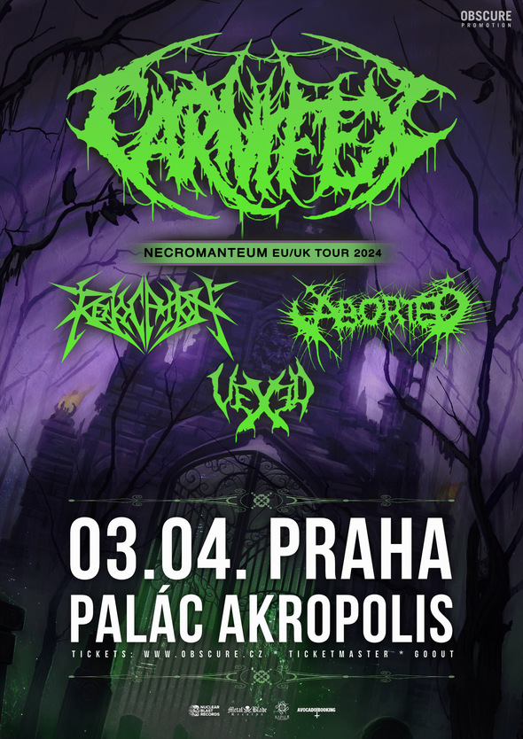 timing: 17:30 – doors 18:00–18:30 – Vexed 18:45–19:30 – Revocation 19:45–20:30 – Aborted 20:45–21:45 – Carnifex Předprodej skončí o půlnoci před koncertem, poté si můžete zakoupit vstupenky i přímo na místě. |